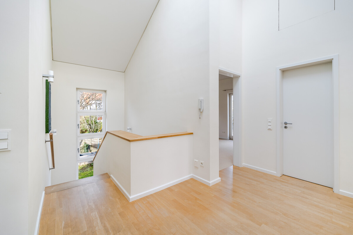 Im Obergeschoss erwarten Sie vier helle Zimmer mit geöffneten Decken, ein Elternbereich mit Ankleide sowie zwei Bäder. Das Untergeschoss bietet ein Gästezimmer mit Bad und weitere Nutzräume.